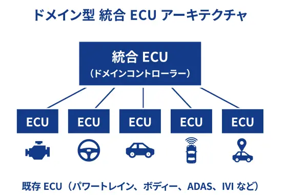 ECU(Electronic Control Unit)とは、自動車に搭載されている膨大な数の電子機器を制御するユニットのこと。近年、自動車の機能が複雑化するなかで、電子機器の数が多くなりコストが増えることや、設置スペースの不足が課題となっています。これらを一つのユニットに統合することで、部品重量の削減や、自動運転をはじめとするより高度なシステムの実装が叶えられます。